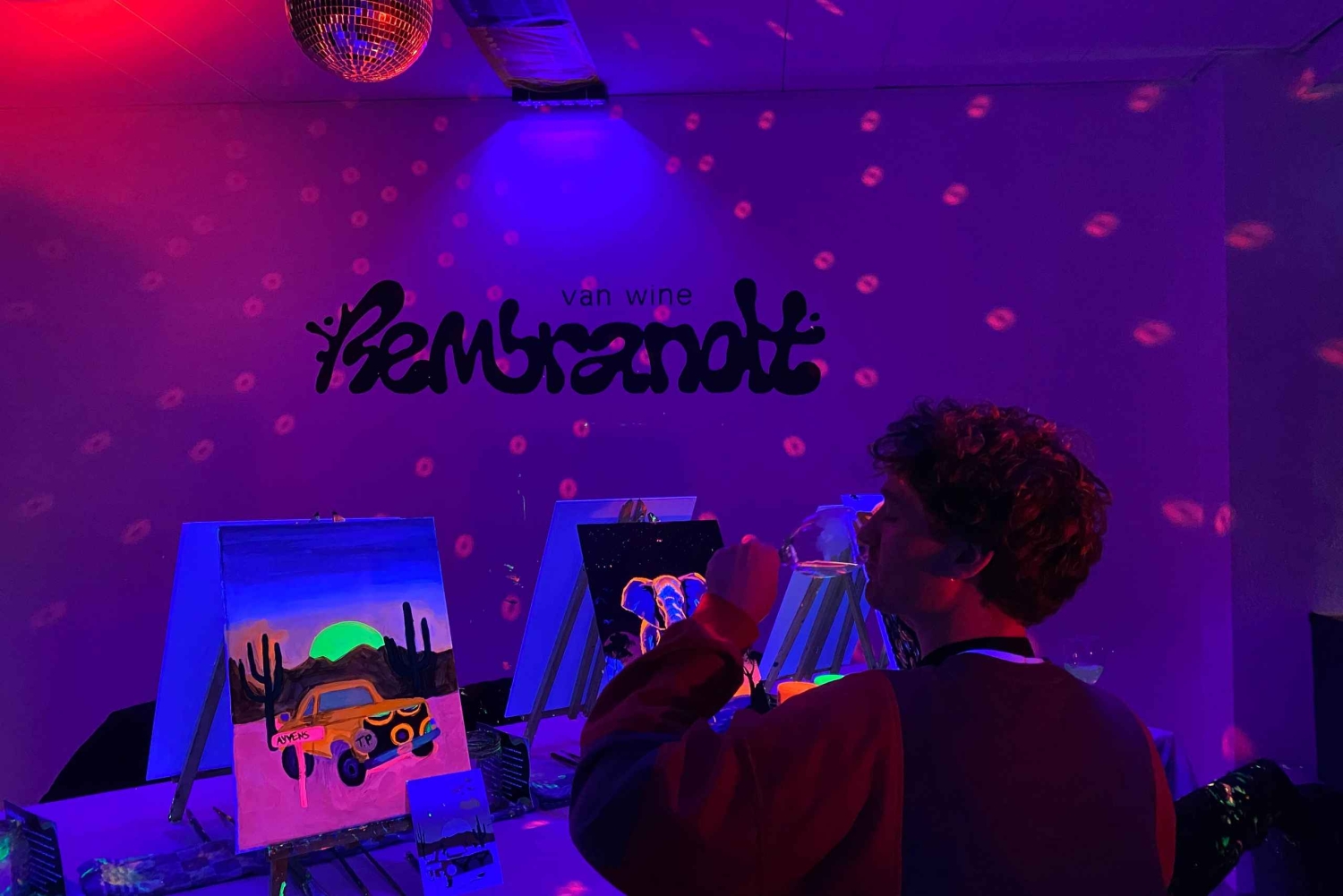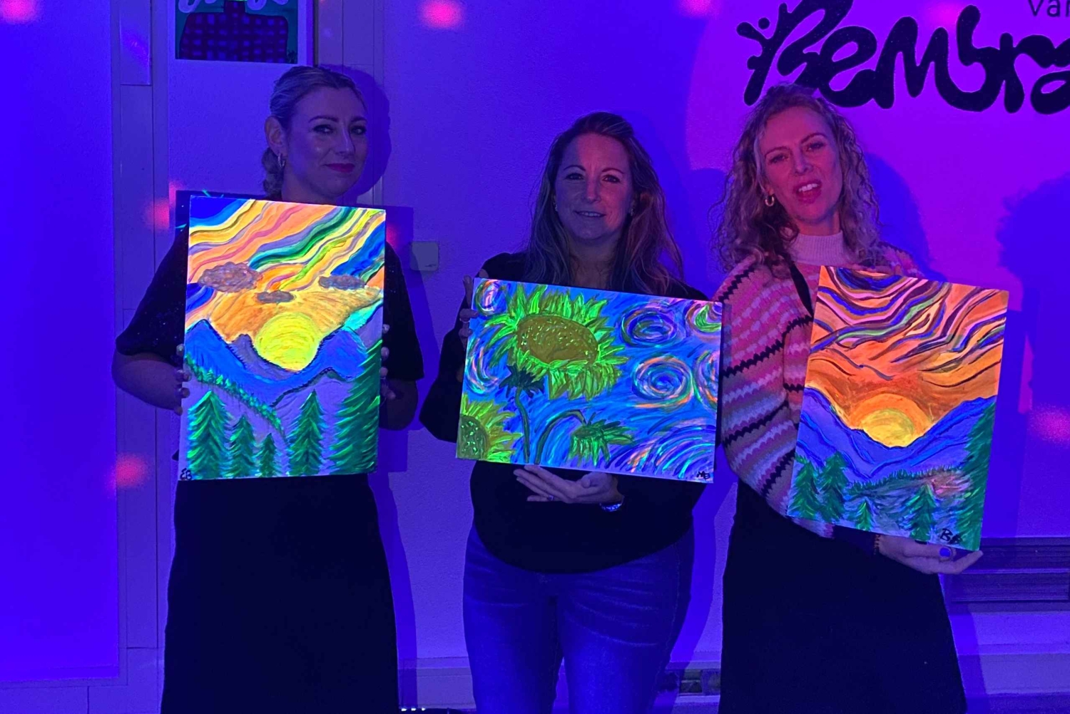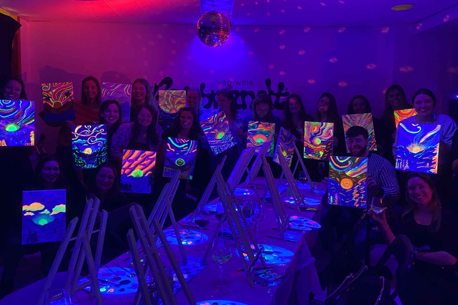 アンテルペンで楽しむ暗闇でのペイント&ドリンク | レンブラント・バン・ワイン 暗闇の中でワインを1杯(何杯でも、ボトムレスです!)楽しみながら、内なるアーティストを解き放つことができる、ユニークでエキサイティングなイベントにご参加ください。ネオンペイント、ワイン、ミラーボール、そして良い雰囲気を満喫できる、今までにない夜のお出かけをお楽しみください。 絵画の経験は必要ありません。才能あるインストラクターが全工程をご案内しますので、誰もが本物の芸術作品をお持ち帰りいただけます。ワインは創造性を刺激するのに役立つと信じています! 必要なドリンクや材料はすべてこちらで用意いたしますので、ワクワクする笑顔でお越しいただくだけで結構です。 経験豊富なアーティストの方にも、ただ楽しくユニークな夜を過ごしたい方にも、レンブラント・バン・ワインは最適なイベントです。自分の芸術的な側面を探求し、アントワープで思い出に残る夜をお楽しみいただくこの機会をお見逃しなく!Includes
