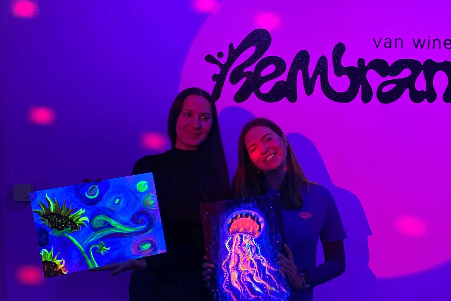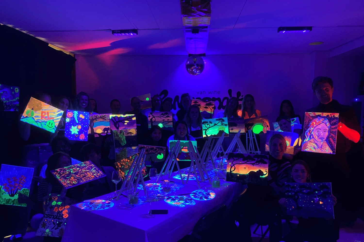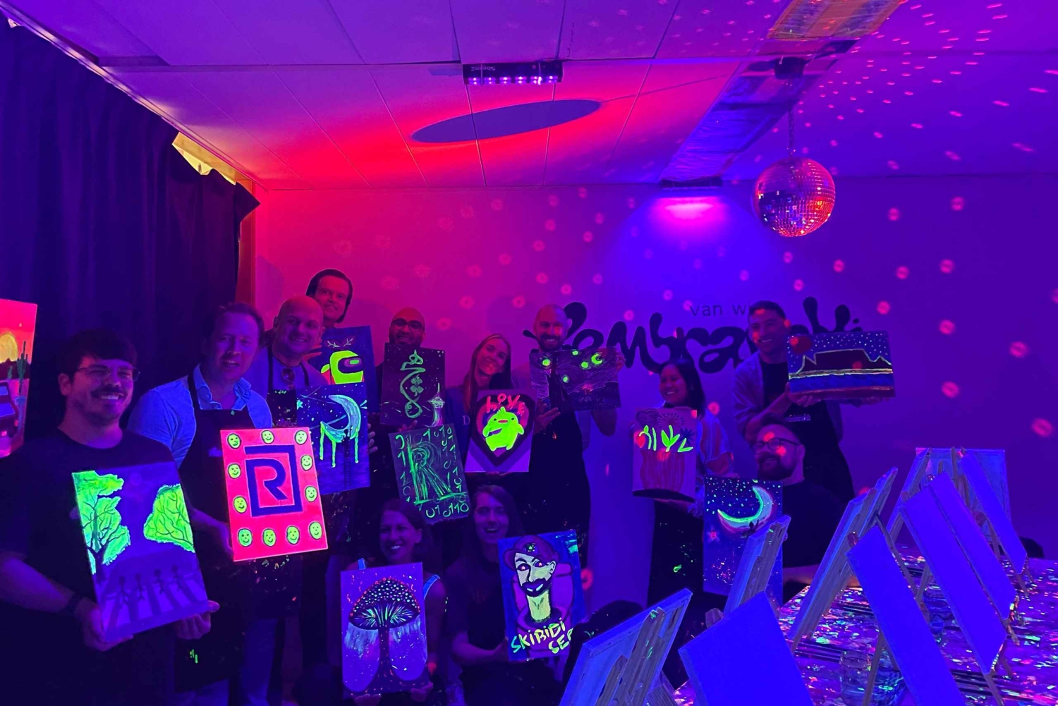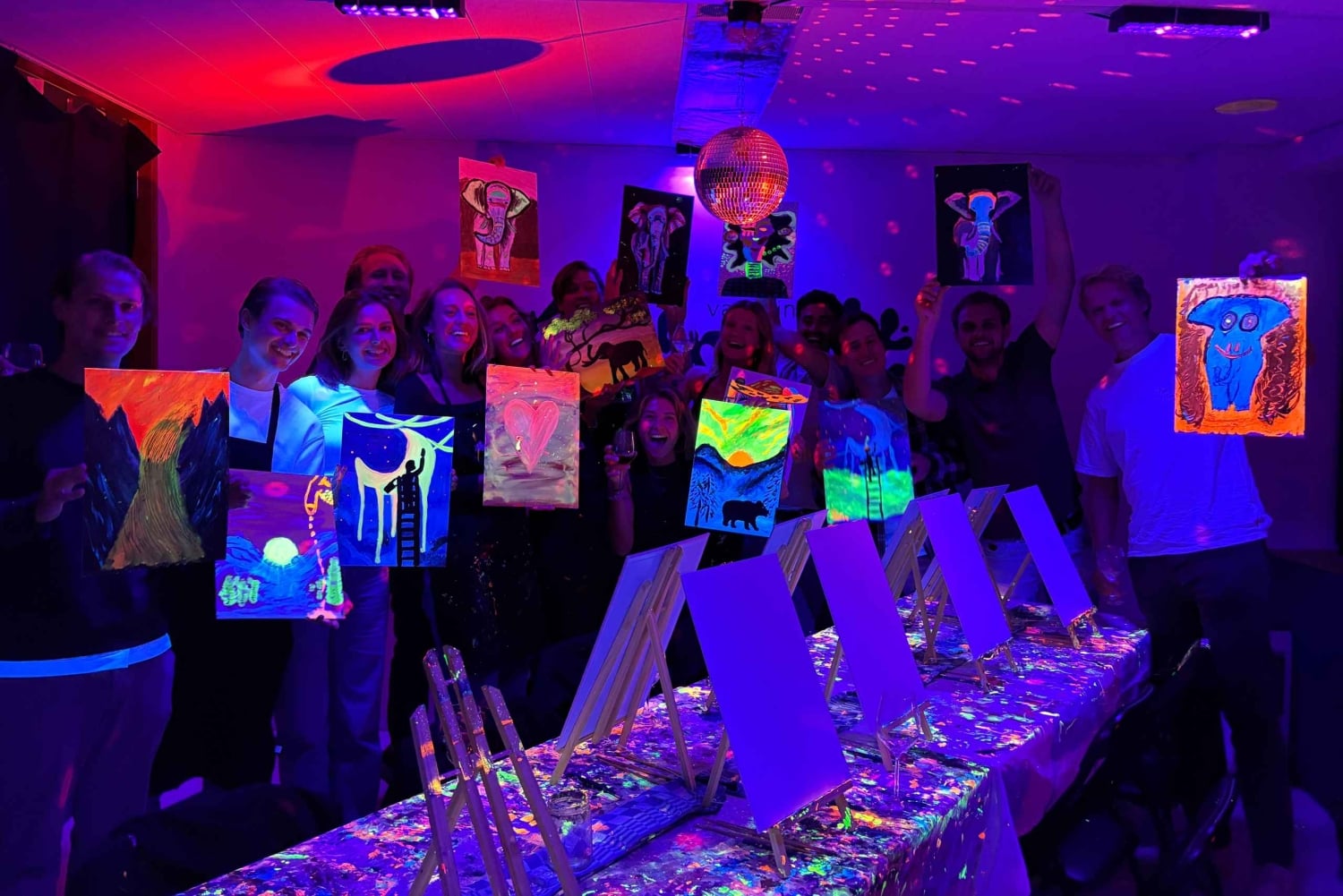 アンテルペンで楽しむ暗闇でのペイント&ドリンク | レンブラント・バン・ワイン 暗闇の中でワインを1杯(何杯でも、ボトムレスです!)楽しみながら、内なるアーティストを解き放つことができる、ユニークでエキサイティングなイベントにご参加ください。ネオンペイント、ワイン、ミラーボール、そして良い雰囲気を満喫できる、今までにない夜のお出かけをお楽しみください。 絵画の経験は必要ありません。才能あるインストラクターが全工程をご案内しますので、誰もが本物の芸術作品をお持ち帰りいただけます。ワインは創造性を刺激するのに役立つと信じています! 必要なドリンクや材料はすべてこちらで用意いたしますので、ワクワクする笑顔でお越しいただくだけで結構です。 経験豊富なアーティストの方にも、ただ楽しくユニークな夜を過ごしたい方にも、レンブラント・バン・ワインは最適なイベントです。自分の芸術的な側面を探求し、アントワープで思い出に残る夜をお楽しみいただくこの機会をお見逃しなく!Includes