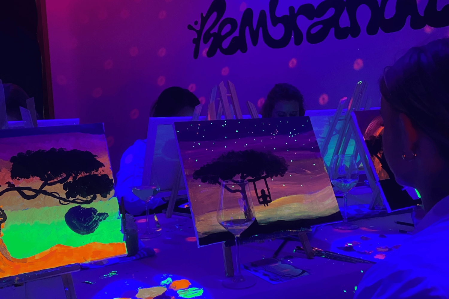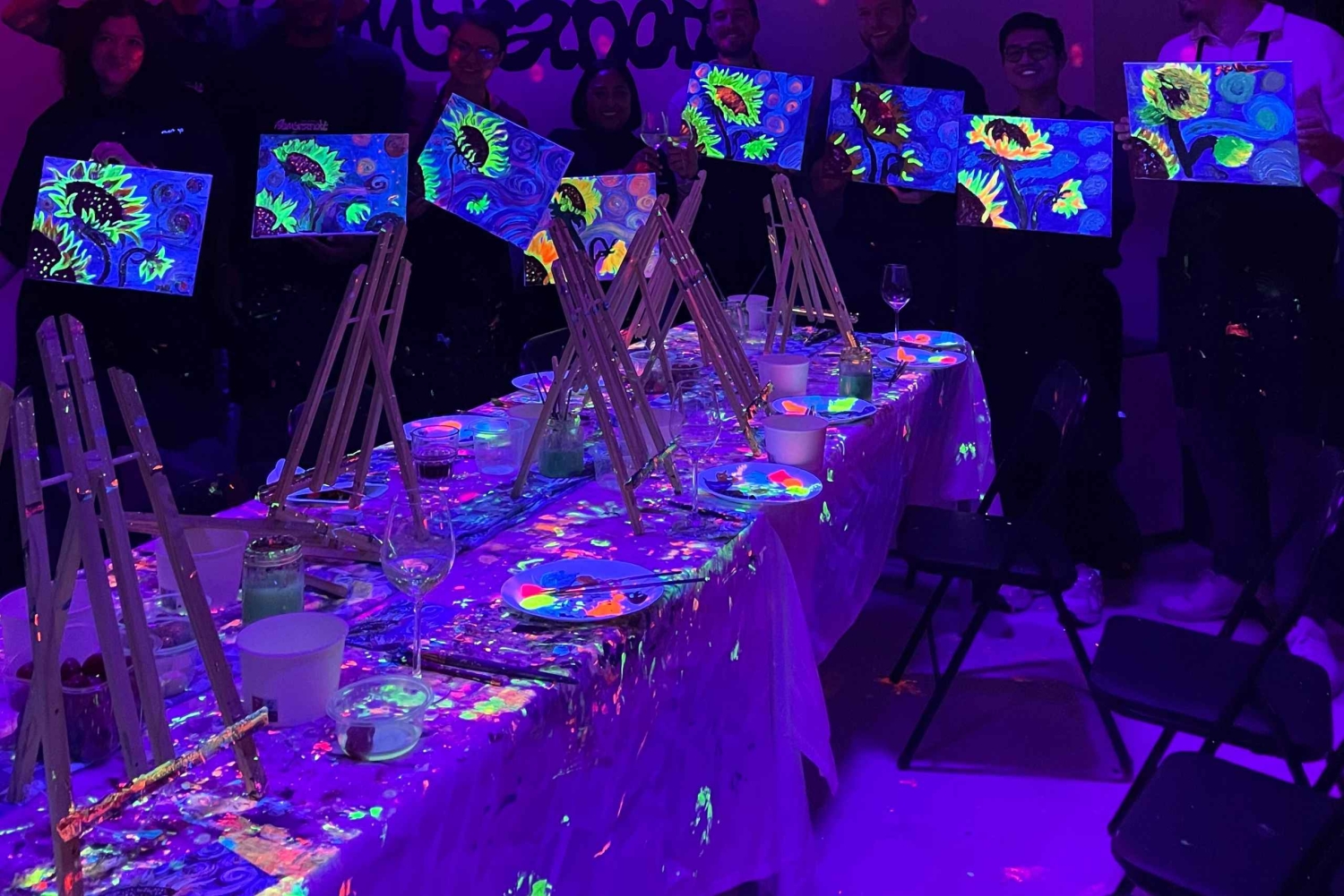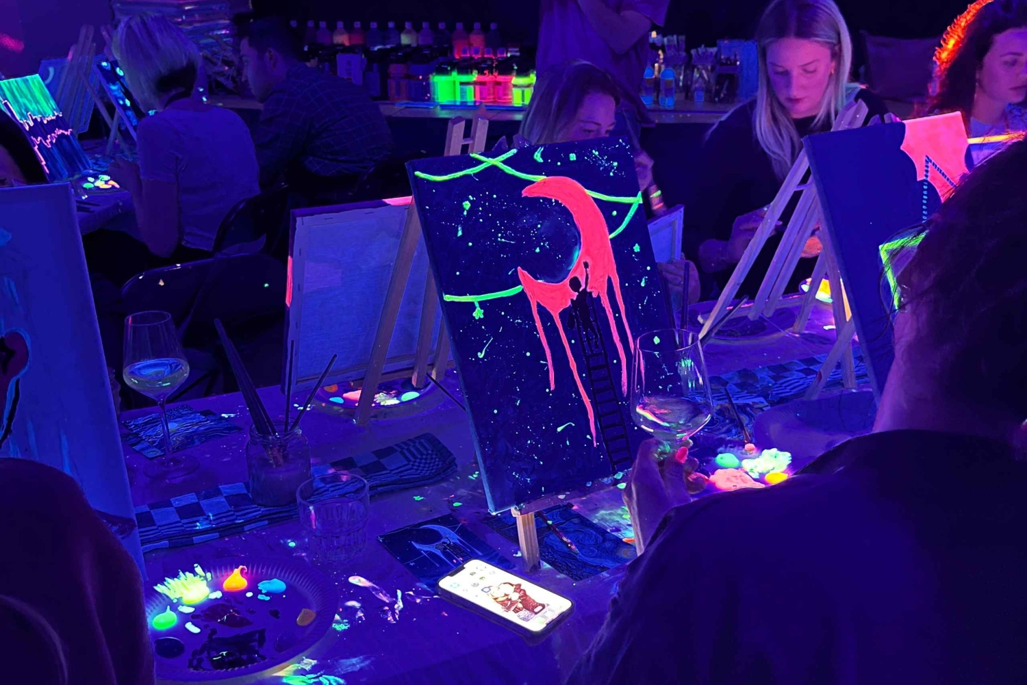 - 暗闇の中で楽しむ究極のペイントパーティーです!ネオンペイント、ワイン飲み放題、そして良い雰囲気をお楽しみください。