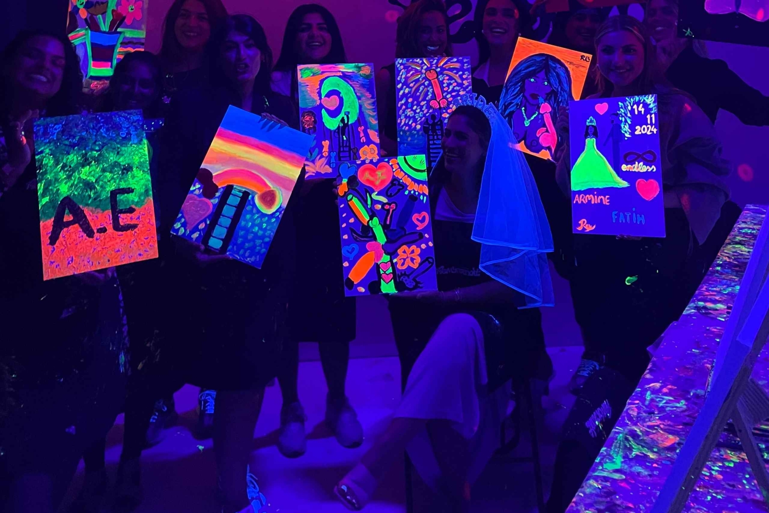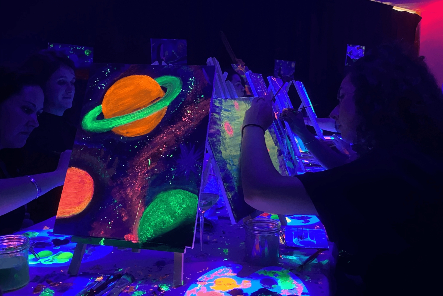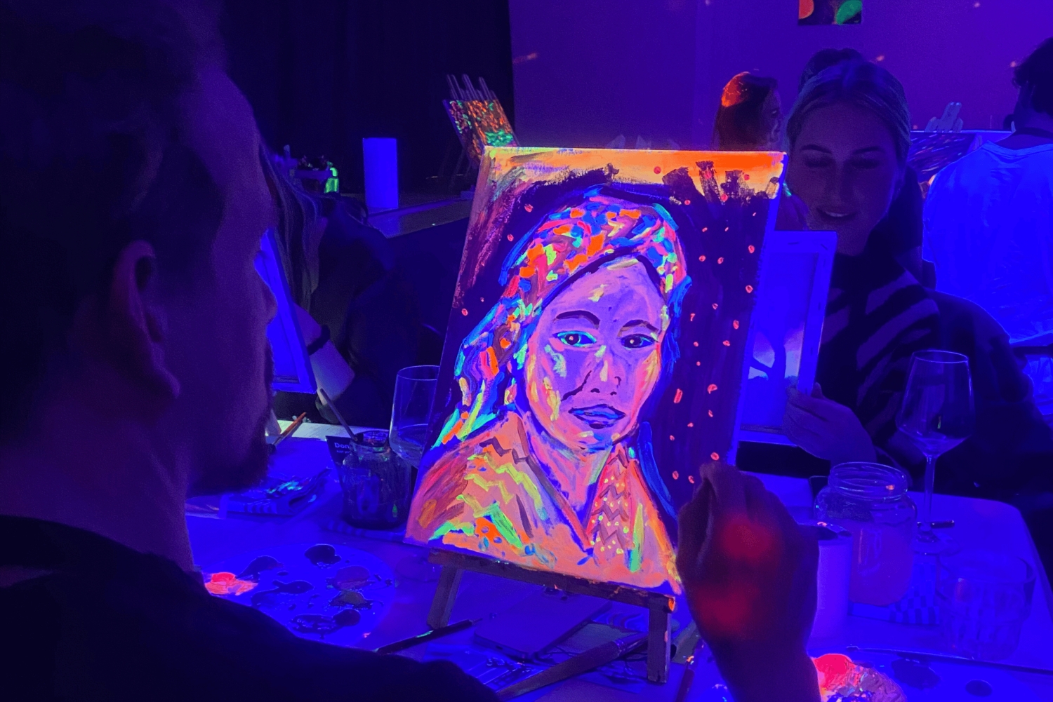 - 暗闇の中で楽しむ究極のペイントパーティーです!ネオンペイント、ワイン飲み放題、そして良い雰囲気をお楽しみください。